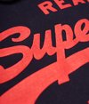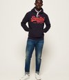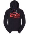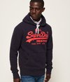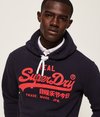 Superdry Vintage Logo Hoodie für Herren. Dieses klassische Hoodie zum Überziehen präsentiert sich mit einer strukturierten Version des legendären Superdry Logos auf der Brust, einer Kängurutasche auf der Vorderseite und einer verstellbaren Kapuze mit Kordelzug. Abgerundet wird das Design mit der charakteristischen orangefarbenen Seitennaht.