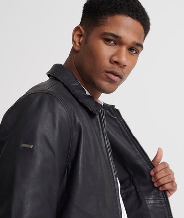 Leichte Superdry Curtis Lederjacke für Herren. Diese hochwertige Jacke aus Lammleder ist die perfekte Wahl für den Übergang. Sie verfügt über einen durchgehenden Reißverschluss, Bündchen mit Druckknopfverschluss, einen verstellbaren Saum mit Druckknopfverschluss für eine perfekte Passform, zwei Taschen mit Druckknopfverschluss und eine Innentasche für Brieftasche oder Handy. Ein dezentes Superdry Metalllogo auf einem Ärmel vervollständigt das Design.
